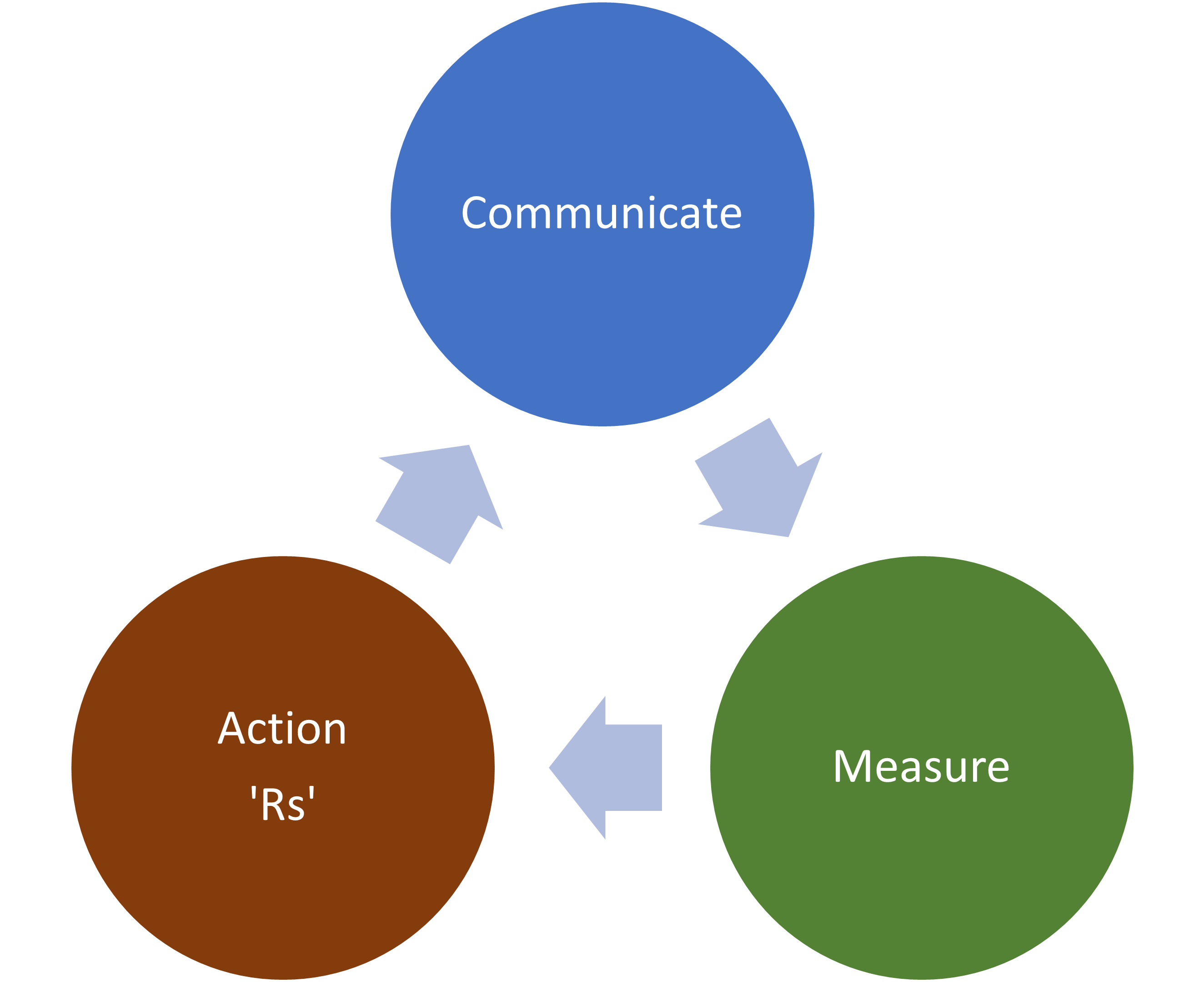 The three steps to manage sustainability for your production is Communicate, Measure and Action