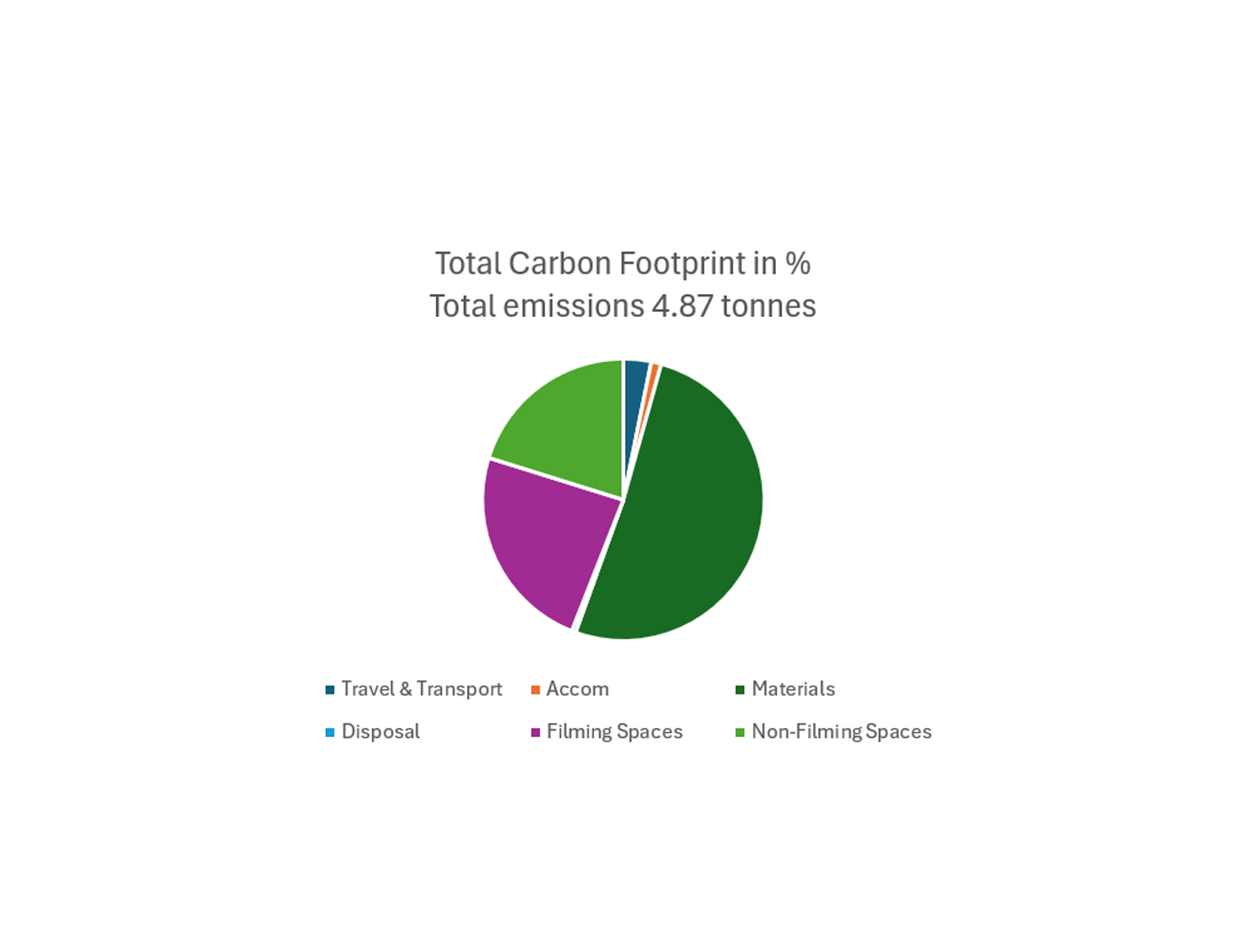 This was not due to Catering not implementing a sustainability strategy, in fact emissions associated with catering for the crew size in itself were quite small due to Caterflix adopting the appropriate sustainability measures. The case was that Energy and Travel was significantly reduced as resources were limited so cost effective measures, for example carpooling, were adopted to a greater extent than on other productions with more resources which ultimately had a positive effect on sustainability outcomes.