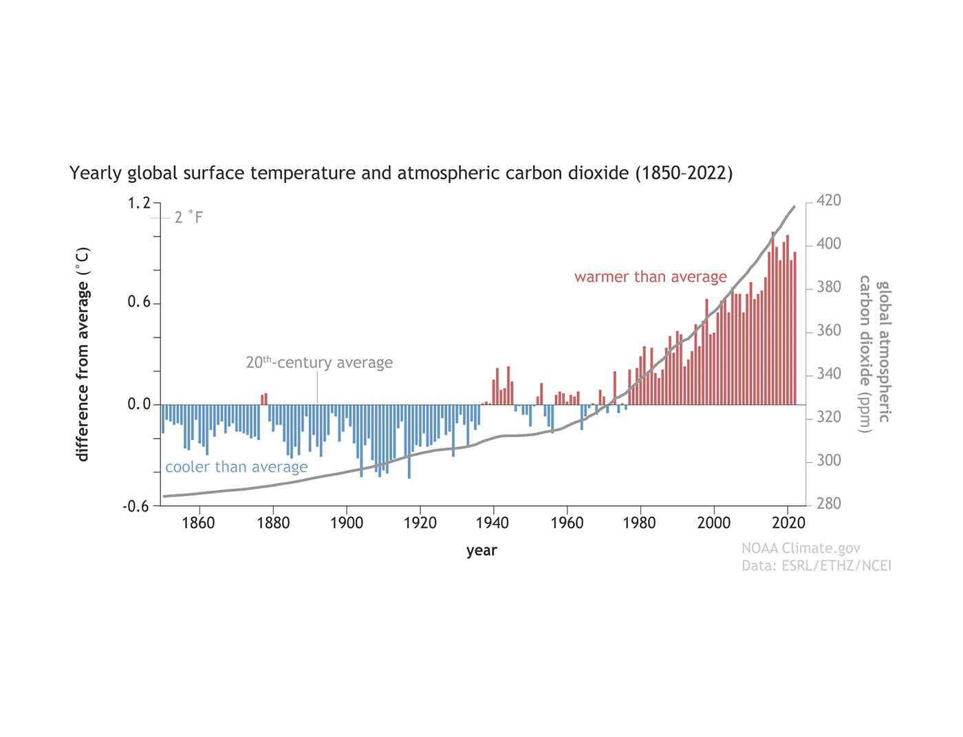 As the amount of greenhouse gases in the atmosphere increases (right hand scale), so does the temperature (left hand scale).
