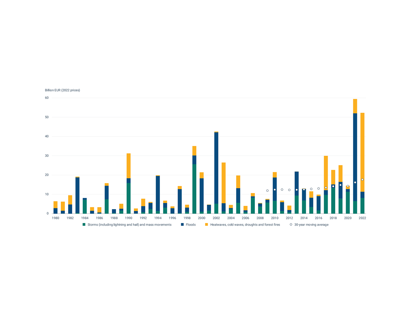 Between 1980 and 2022, weather and climate related extremes caused economic losses of assets estimated at €650 billion in the EU Member States, of which €59.4 billion occurred in 2021 and €52.3 billion in 2022.