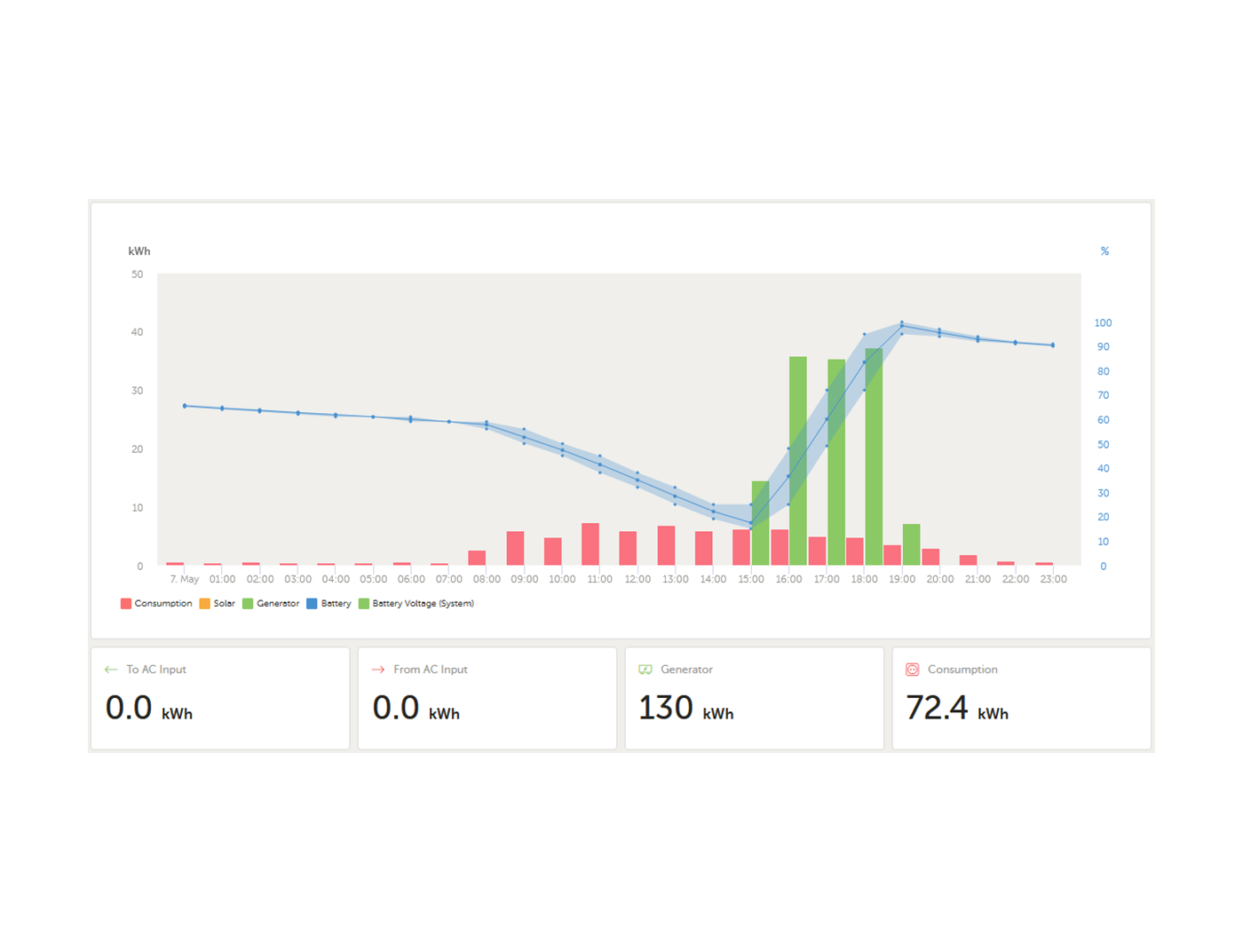 It is recommended that future trials of the hybrid system be designed to collect more accurate data around fuel use. Future trials should also be designed to compare different generator types/sizes, and there should be back-to-back trials of the hybrid system vs the generator on its own in order to get really good apples:apples data about the actual fuel savings.