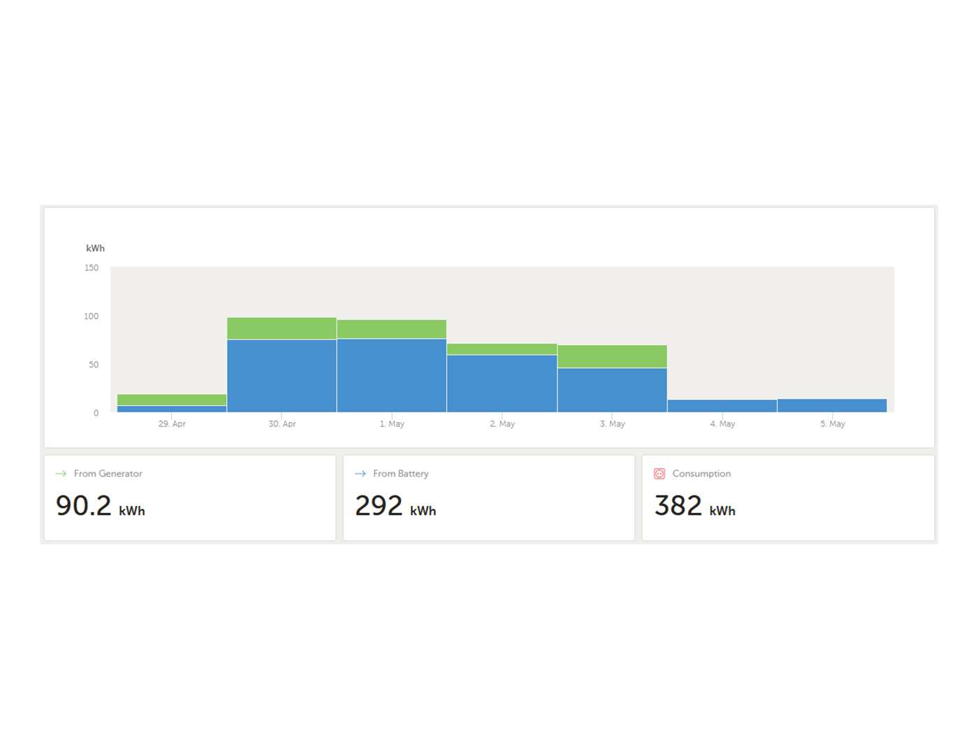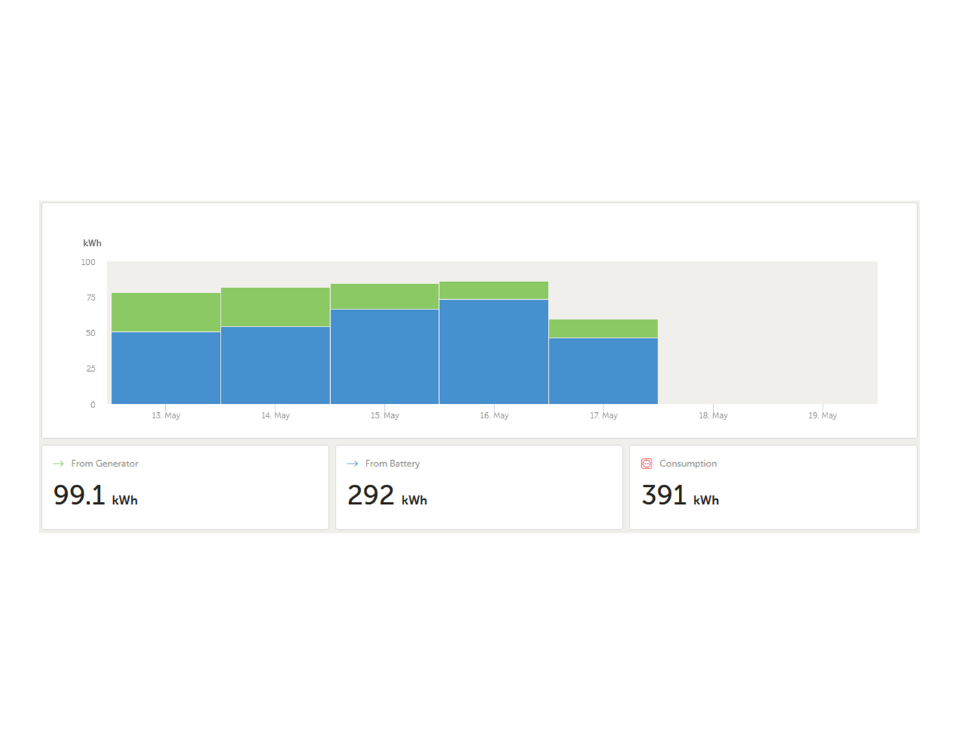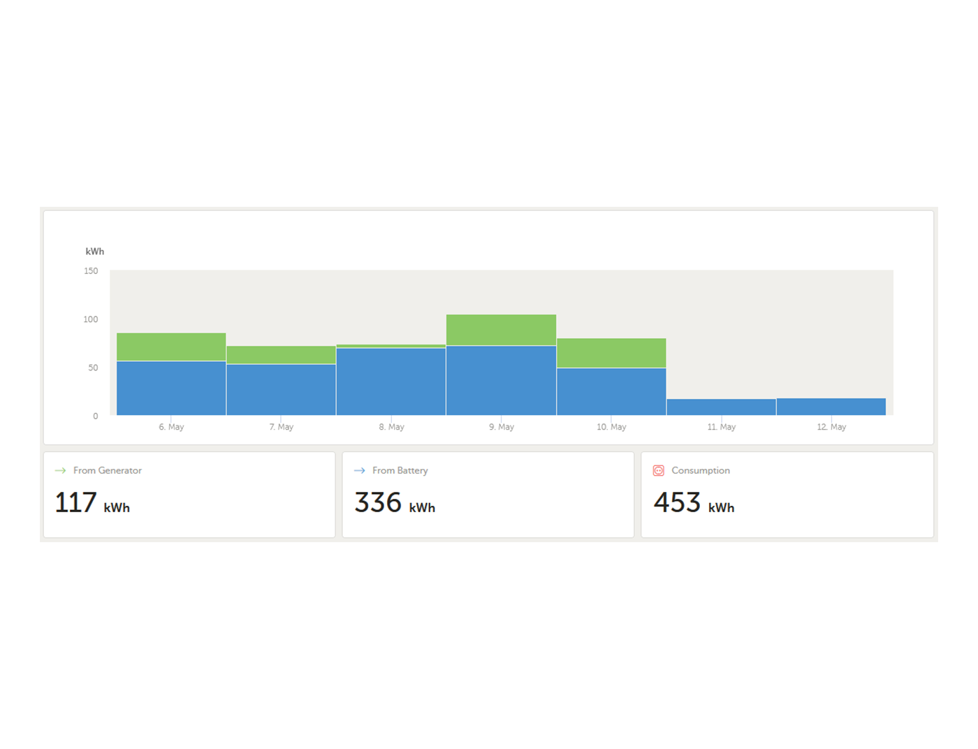 The hybrid battery system reduces generator run-time by between 60% and 90% across a full week, depending on how fridges are powered at night and at weekends. When the generator is fuelled with HVO this yields a combined emissions reduction of the order of 95-99%.