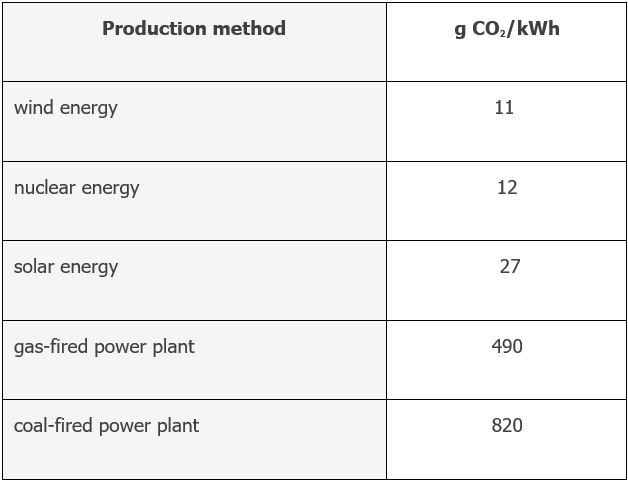 The following table shows the amount of CO2 produced per kWh for specific types of electricity generators: